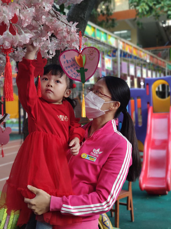 在高明区机关幼儿园,一名教师正在帮助小朋友挂上校园装饰。佛山日报记者陈嘉懿摄