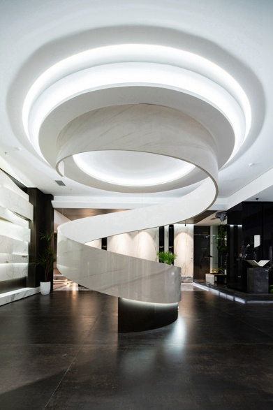 在马可波罗总部展厅,在马可波罗全国终端专卖店,我们有时会看到这样的「曲线曲面」的身影,它们共同组成空间的惊叹符。