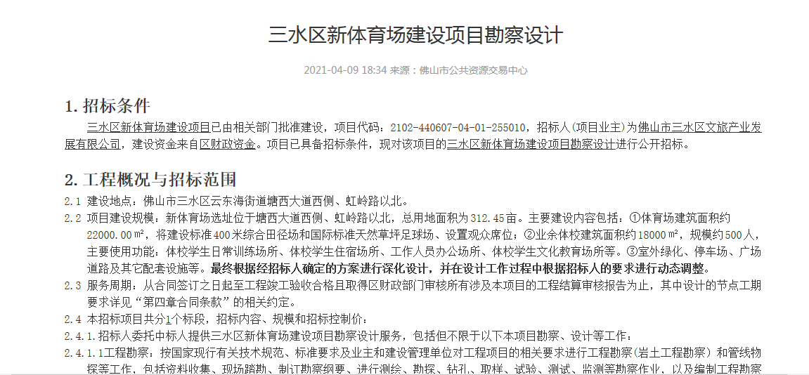 佛山市公共资源交易中心发布的《三水区新体育场建设项目勘察设计》招标公告截图。