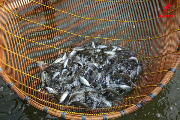 九江养殖户崔常乐用九江鱼筛对鱼苗进行筛选。