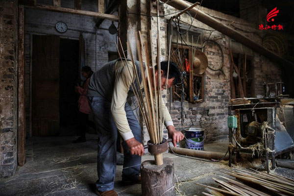 张华成师傅用“莲花刀”开竹,使每条竹条大小均匀。