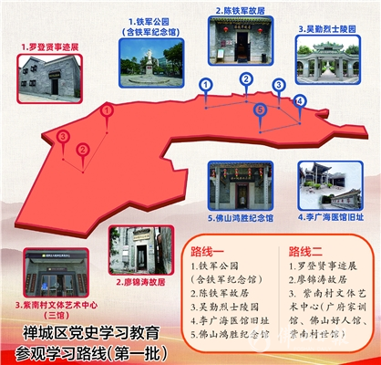 禅城区公布的首批党史学习教育参观学习路线有两条,一条位于禅城中心片区,另一条则位于南庄片区。路线指引清晰列明了各个点位的地址、开放时间、预约电话、参观时长、公共交通以及点位简介等,方便各镇街各单位就近就便结合“三会一课”开展学习教育等活动,让党员干部身临其境学习革命传统、厚植爱党爱国情怀。