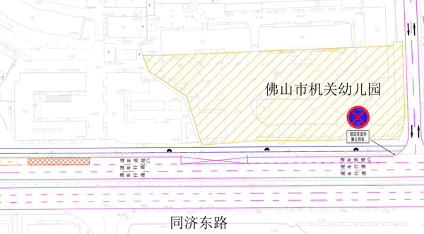 同济路东往西方向,靠近佛山市机关幼儿园的最右侧车道设置为送学专用车道。