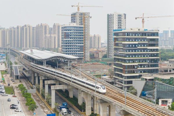 “肇佛广莞深”城际列车缓缓驶出三水北站。/佛山日报记者王澍摄