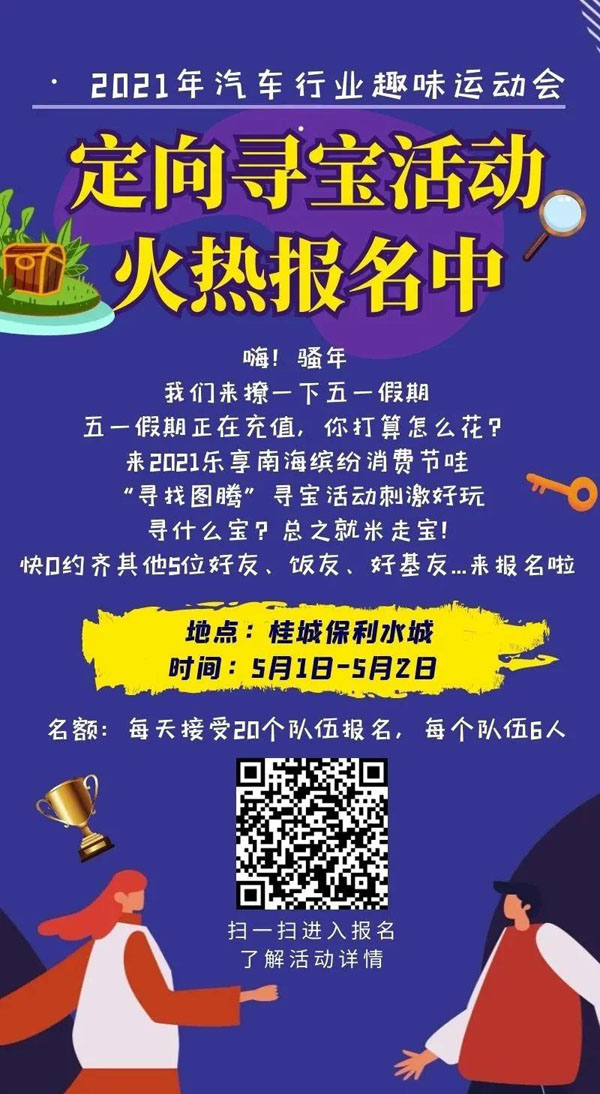 ②第二届南海汽车美食嘉年华期间,将举行汽车行业趣味运动会定向寻宝活动,你也想参与?赶紧组团报名吧!