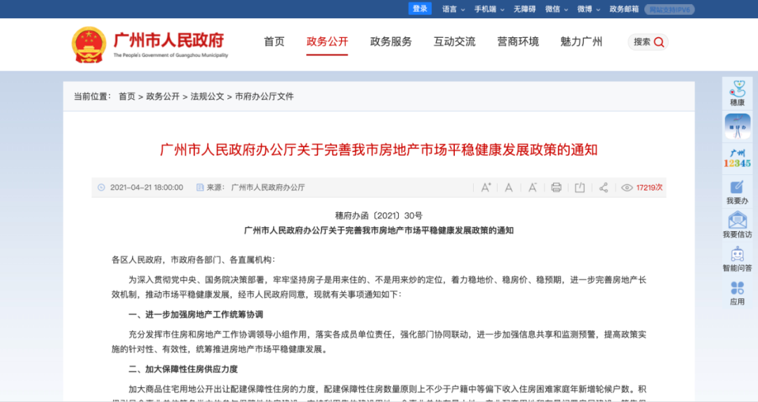 为深入贯彻党中央、国务院决策部署,牢牢坚持房子是用来住的、不是用来炒的定位,着力稳地价、稳房价、稳预期,进一步完善房地产长效机制,推动市场平稳健康发展,市政府办公厅印发了《关于完善我市房地产市场平稳健康发展政策的通知》(穗府办函〔2021〕30号),自2021年4月22日起执行,现解读如下: