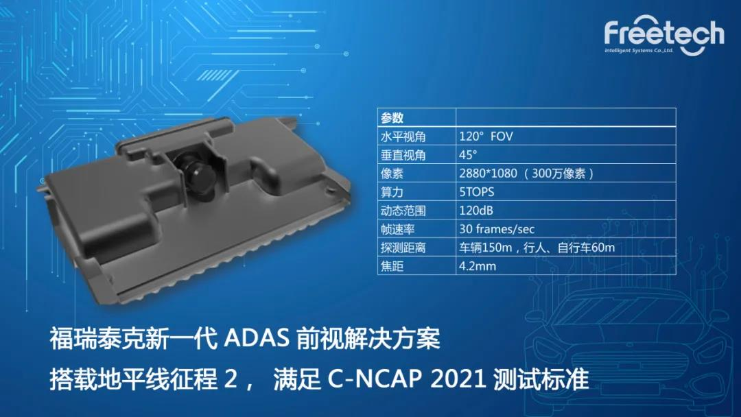 搭载地平线征程2芯片的福瑞泰克新一代ADAS前视解决方案,在视觉感知算法与摄像头规格上得到大幅度提升,视场角升级至100度,感光芯片提高到300w像素,超过1080p高清,实现前向探测功能包括ACC、AEB、LDW、FCW、LKA、ELKA、PA、TSR、IHBC等主动安全功能,提高驾乘人员和外部交通参与者的乘车安全性。新一代ADAS前视解决方案大量采用CNN等深度学习算法,在对行人、二轮车、道路结构信息、交通标识以及交通灯识别上大幅度提升识别能力和识别精度。