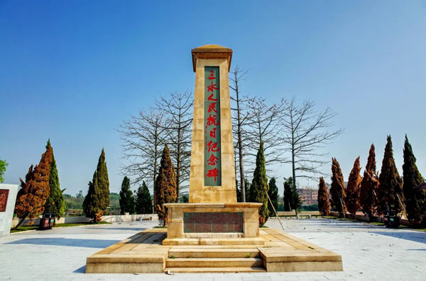 位于佛山市三水区乐平镇源潭村委会圳西村虎头岗。纪念碑建于1997年,坐北向南,碑正面宽1.6米,侧面宽1.6米,高5.97米,基座长方形,由条形花岗岩石铺砌。碑正面刻有原珠江纵队政委梁嘉题写的“三水人民抗日纪念碑”九个大字。纪念碑对研究三水的抗日战争史及进行爱国主义教育具有重要的历史价值和现实意义,是区级爱国主义教育基地、区级国防教育基地、三水区文物登记点。