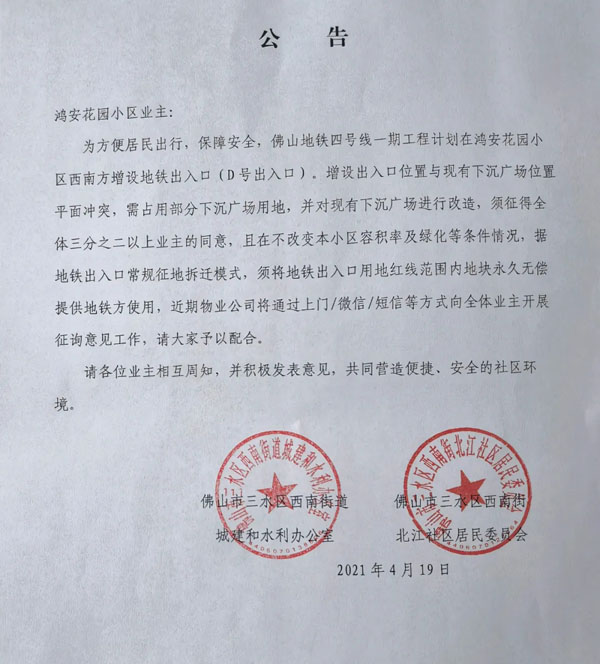 近日,一份关于增设地铁出入口的公告在三水区西南街道鸿安花园业主群中广为流传。该公告显示,佛山地铁四号线一期工程计划在鸿安花园小区西南方增设地铁出入口(D号出入口),但增设出入口位置与现有下沉广场位置平面冲突,需占用部分下沉广场用地,并对现有下沉广场进行改造,须征得全体三分之二以上业主的同意,且在不改变本小区容积率及绿化等条件情况,据地铁出入口常规征地拆迁模式,须将地铁出入口用地红线范围内地块永久无偿提供地铁方使用。