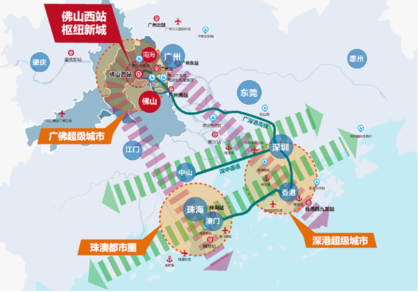 首先,西站是佛山这个城市最大的流量入口,来自云南、贵州、四川、广西等地的人坐高铁到佛山,先到达的往往就是西站。而佛山人到深圳、香港,从佛山西站走是最快捷的。从西站出发,实现一小时内直达广州、深圳、香港三大核心城市。这一小时生活圈内覆盖了近亿人口,为企业发展提供极大的便利和潜在市场。