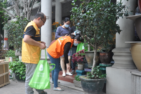志愿者在公仔街检查器皿有无积水。/通讯员供图