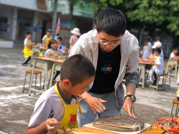 高明区泽英小学佛陶艺术社团指导教师黎永强正在指导学生制作陶艺作品。