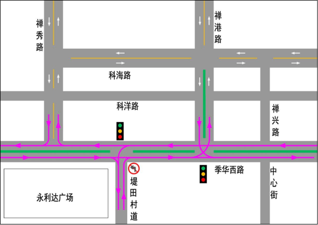 ②季华西路—堤田村T字路口,设置灯控,禁止南进口左转,其他方向均可通行。