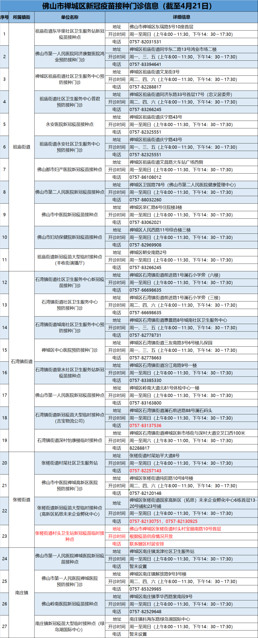 禅城区新冠疫苗接种门诊(27个)