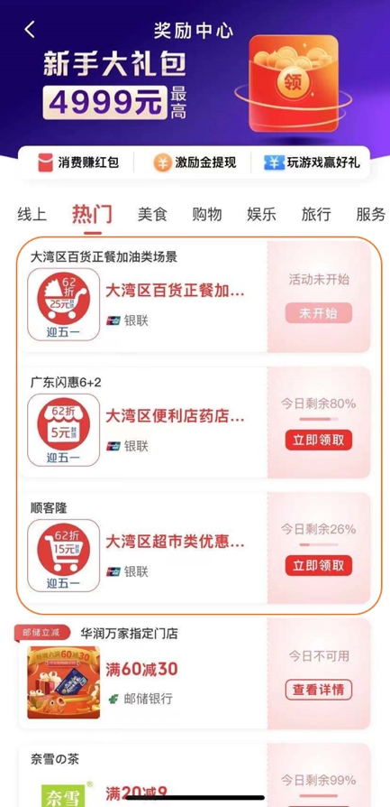 五一假期期间,云闪付推出“大湾区活动”专享优惠券,提供覆盖多种场景的支付优惠与全方位的支付服务,用户登陆app即能免费领取62折优惠券。百货、母婴、正餐、加油以及景区场景内使用优惠券,最高减免25元;超市场景内使用最高减免15元,便利店、药店及轻餐饮场景内最高减免5元。