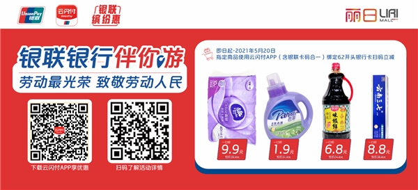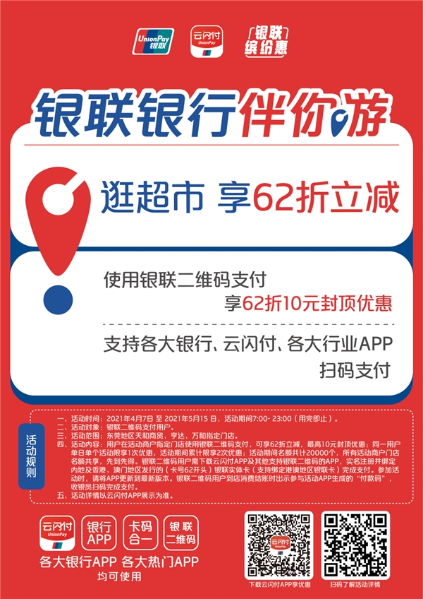 东莞市则联合全市20家超市门店推出“银联银行伴你游”超市节活动,5月15日之前到指定的超市门店使用云闪付app“银联二维码”支付任意金额即可享受62折优惠,单笔最高减免10元。