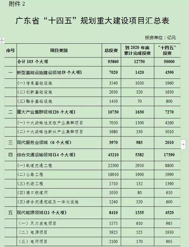 文件同步公布了广东“十四五”规划的重大建设项目,其中综合交通运输领域共有14个大项目。总投资43210亿元,约占总投资份额的一半!