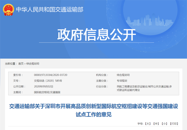 2020年,交通运输部一份文件《关于深圳市开展高品质创新型国际航空枢纽建设等交通强国建设试点工作的意见》中提到——