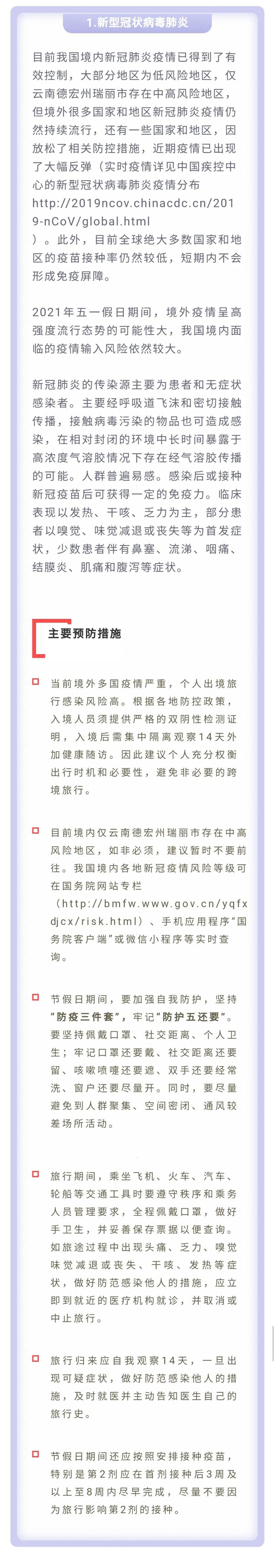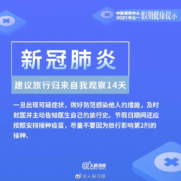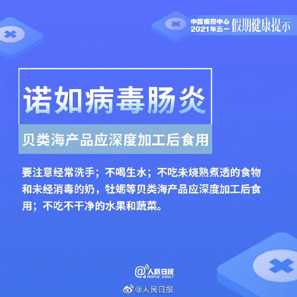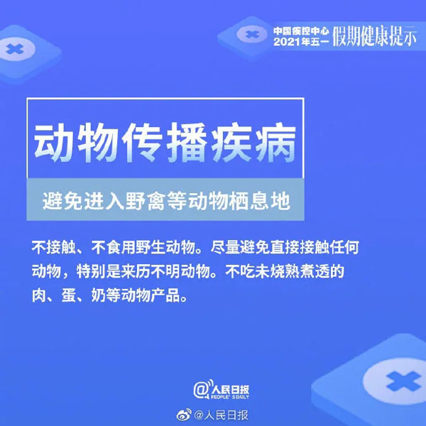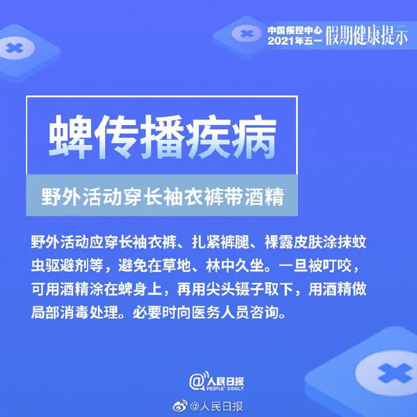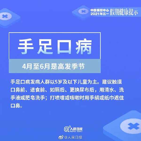 为平安健康地享受美丽的春天以及与亲友欢聚的美好时光,中国疾病预防控制中心温馨提示:今年五一假日期间,要重点做好新冠肺炎、诺如病毒肠炎、手足口病、蜱传播疾病、动物传播疾病和食物中毒的预防与防范。