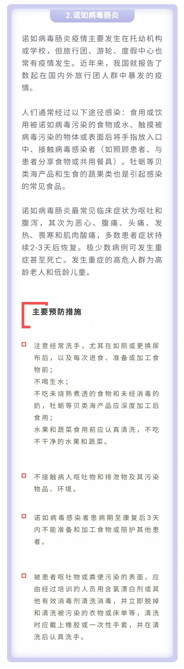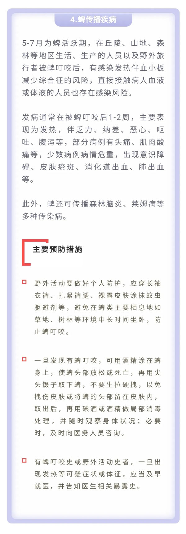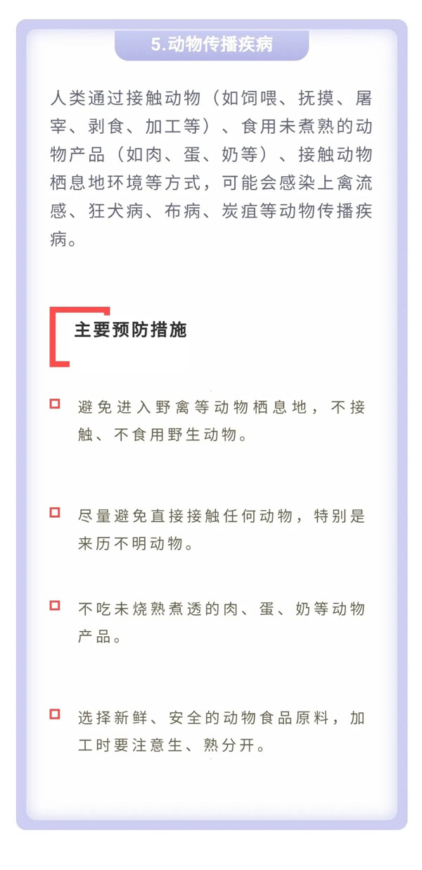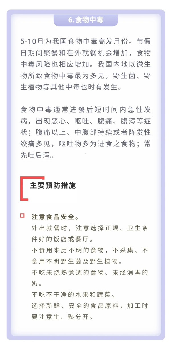 为平安健康地享受美丽的春天以及与亲友欢聚的美好时光,中国疾病预防控制中心温馨提示:今年五一假日期间,要重点做好新冠肺炎、诺如病毒肠炎、手足口病、蜱传播疾病、动物传播疾病和食物中毒的预防与防范。