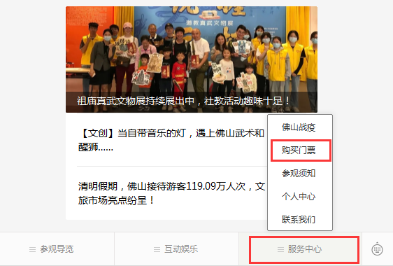 购票流程:关注“佛山市祖庙博物馆”微信,点击菜单栏“服务中心——购买门票”,即可进入购票页面。