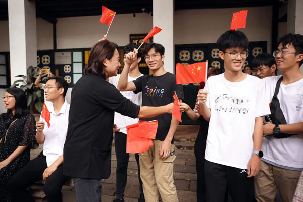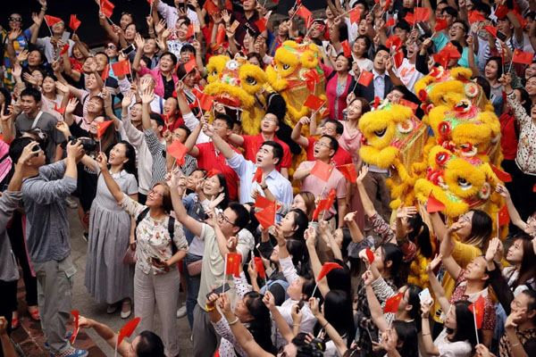 大家挥舞着鲜艳的五星红旗
