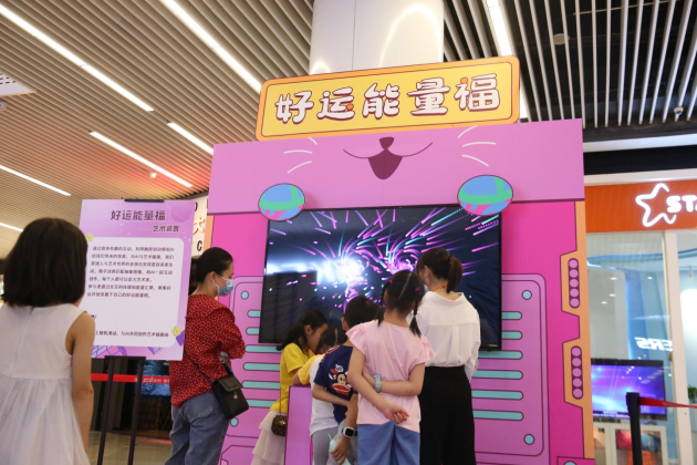 今年好运节的突破就是越来越酷炫的科技能量体验感。在好运星球外的好运星空间,参与者以四方猫的视角沉浸于浩瀚星河中,通过操控台体验改变星辰运转和扭转时空的酷炫视效,就像获取了无限能量在宇宙中穿梭飞跃。而另外一个亮点就在好运能量福这个体验环节了,参与者通过划动界面进行人机交互,创作出极具个人特色的粒子数码抽象画。好运能量福中屏幕界面粒子的分离组合与汇聚,就好像可视化的能量场,还可以即刻保存自己的能量图,让好运气一直伴随着你。