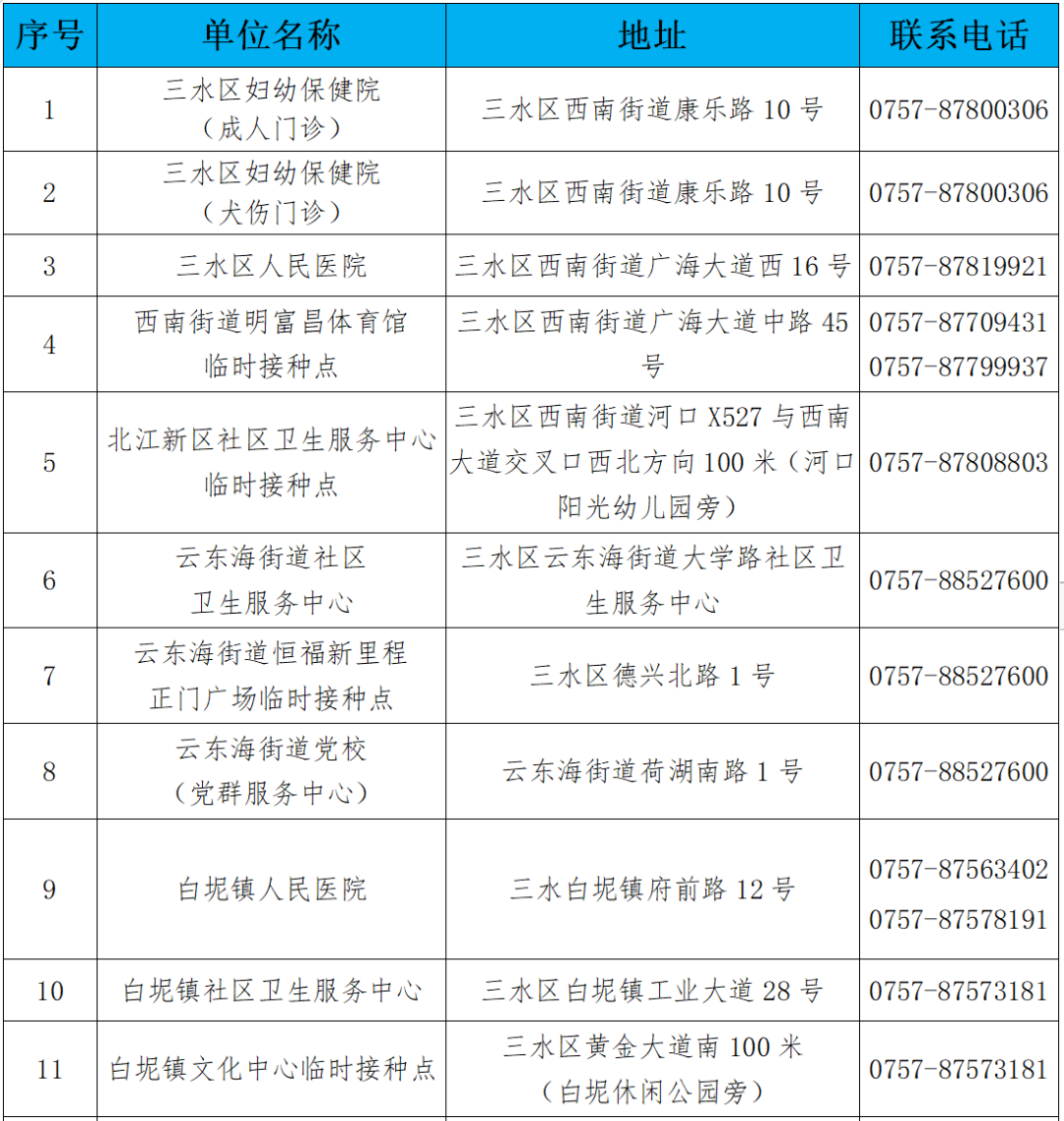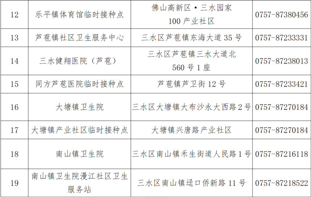 目前三水区投入使用的门诊共19个,现阶段疫苗库存充足。符合疫苗接种条件的市民可以致电以下接种点或关注“佛山发布”“三水疾控”微信公众号,了解疫苗接种信息,携带本人居民身份证前往接种即可。大家快去接种吧!