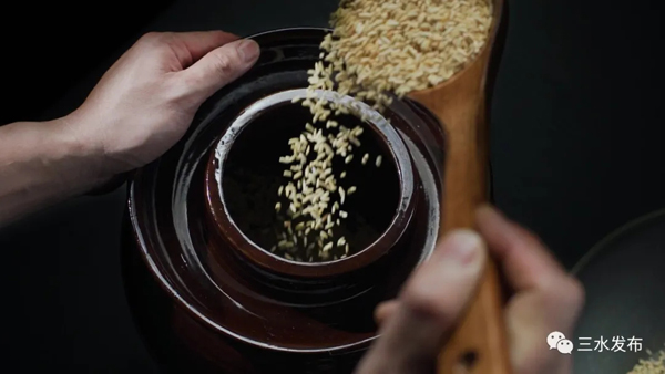炒好的米放入埕中,再加入富硒山泉水。注意要密封醋埕,隔绝空气。
