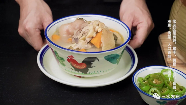 食用时,三水人常选鸡、猪手、黄豆、生姜、番薯、鸡脚、梅菜作配菜。
