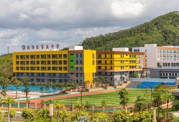 这所学校名字叫做惠阳五中,已于2019年9月正式开学,是集小学、初中、高中于一体的12年一贯制公办学校,占地约10万㎡,建筑面积约7.1万㎡,可容纳学生5000人。