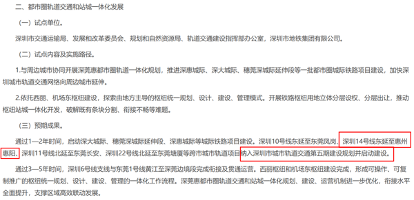 深圳14号线东延至惠州惠阳,纳入深圳市城市轨道交通第五期建设规划并启动建设。