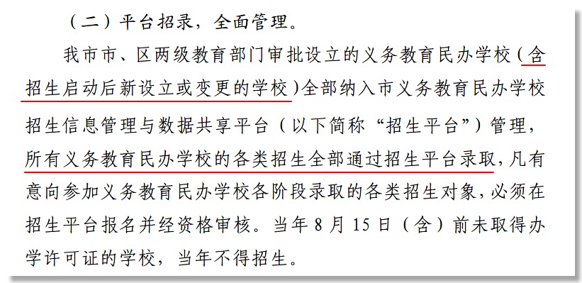 2021年开始,义务教育民办学校全部纳入市义务教育民办学校招生信息管理与数据共享平台(以下简称“招生平台”)管理。当年8月15日前未取得办学许可证的学校,当年不得招生。