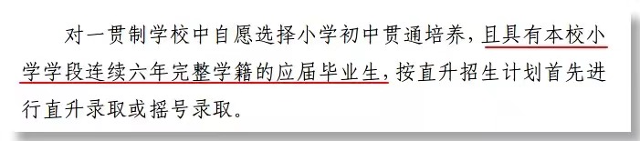 方案中明确了,具有本校小学学段连续六年完整学籍的应届毕业生,按直升招生计划首先进行直升录取或摇号录取。以后插班进入一贯制学校小学部的学生将无法直升初中部。