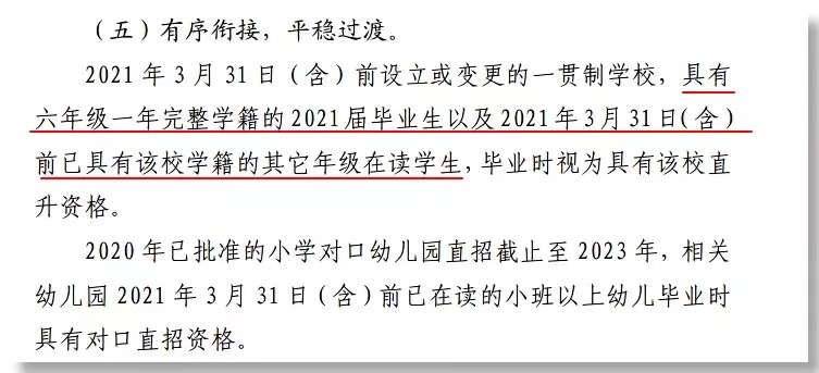 目前在读的一贯制学校小学部学生,是可以有序衔接和平稳过渡的。2021届的毕业生,如具有六年级一年完整学籍,毕业时视为具有直升资格。即于2020年9月1日前完成转学相关手续者即可直升。 对一贯制学校的一至五年级学生而言,只要这些学生在2021年3月31日(含)前已具有该校学籍的,毕业时视为具有该校直升资格。