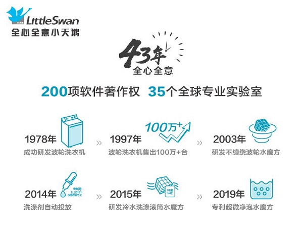 不仅如此,在过去的43年间,无论是面对改革开放的浪潮还是二十一世纪激烈市场竞争,小天鹅也从不满足于现状,从简单的洗涤功能发展到拥有不缠绕水魔方、洗涤剂自动投放、冷水洗涤、超微净泡等逾1000+项专利,从上世纪的一个小厂壮大到拥有35个全球专业实验室、200项软件著作权的成绩,从单一的洗涤机器升级到洗护、烘干全覆盖专业洗烘套装的创新,小天鹅始终用行动在为我们创造惊喜。