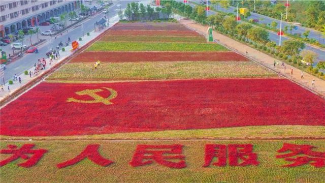 乐平镇粤韵花海中由红红的花朵组成了一面鲜艳的党旗,“为人民服务”五个大字在花田中格外显眼。