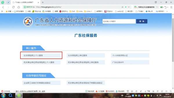 进入广东省人力资源和社会保障厅网上服务平台(网址:http://hrss.gd.gov.cn/gdsbfw/),点击“社会保险网上个人服务”菜单。