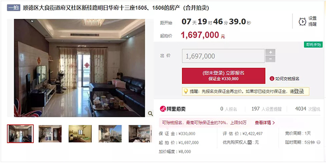 标的物介绍:拍卖财产位于佛山市顺德区大良街道府又社区新桂路明日华府十三座1505、1506的房产(合并拍卖),土地性质国有出让,土地使用权终止日期2071年4月22日。