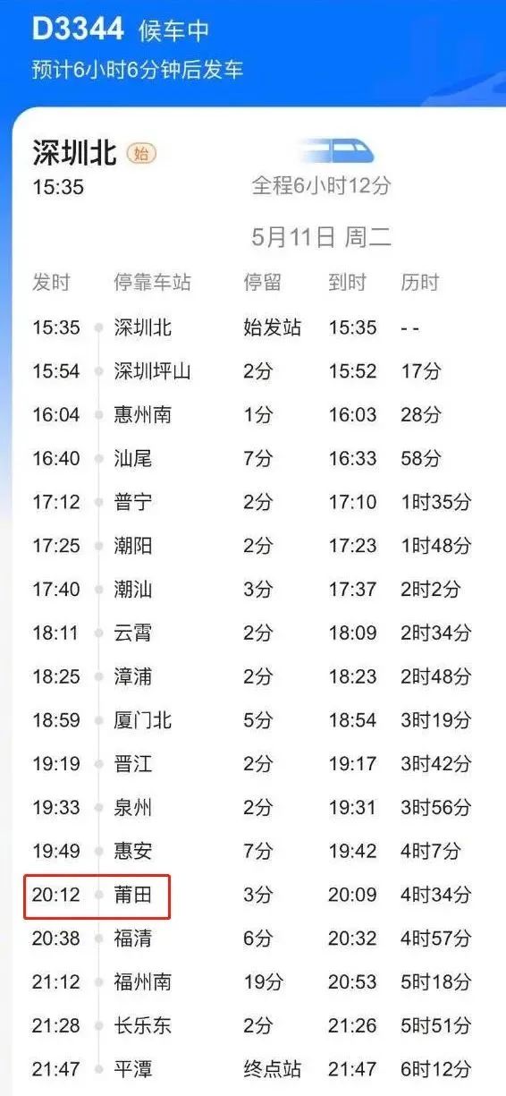 新冠肺炎无症状感染者陈某,于5月1日在深圳北站乘坐动车(D3344次09车厢01C)当日21:47到达平潭。经查询,D3344车次始发站为深圳北,途经深圳坪山、惠州南、汕尾、普宁、潮阳、潮汕等多个站点。