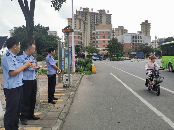 督查组在主要路口监测摩托车及电动自行车的“挂牌率”“安全头盔佩戴率”等。/佛山日报记者卢钰仪摄