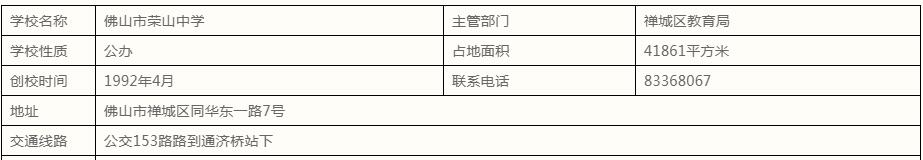 佛山市荣山中学始建于1992年,是一所以高中为主的完全中学。学校秉承“以德启智,多元发展”的办学理念,2017年1月被授予“广东省国家级示范性普通高中”光荣称号。2017年2月被评为“广东省依法治校示范校”。2017年12月被认定为广东省基础教育研究实验基地学校。