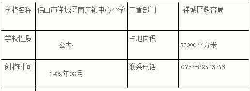 禅城区南庄镇中心小学创建于1989年,设备先进、环境优美,是禅城区首批品牌标杆学校,禅城区最早提供全寄宿服务的公办小学。学校于2008年9月搬迁新校区,主体建筑在公园内兴建,占地98亩。
