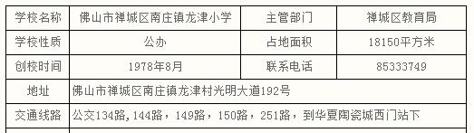 龙津小学座落于龙津村的中心地带,与著名的华夏陶瓷博览城相邻,与美丽的西樵山隔江相望,开办于1978年,于1992年重建。校园面积18150平方米,建筑面积7951平方米, 1996年龙津小学被评为佛山市一级学校,2008年10月顺利通过了“广东省规范化学校”的验收。