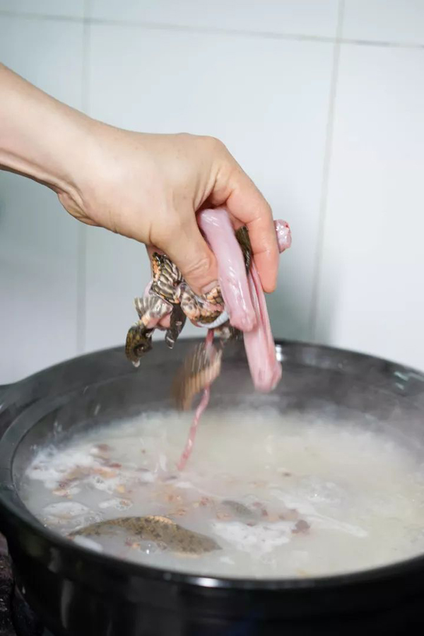 水蛇粥的粥底也很有讲究,要用慢火煲一锅靓粥,这就需要花费数小时。再将已经拆成零件的水蛇被放入粥中,加些姜丝、红枣等配料,熬制到软烂黏稠。