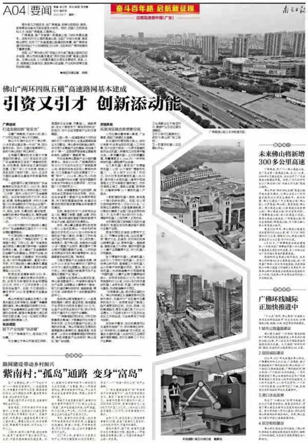 目前,以广佛为核心的“双轴三环九射”高速公路网已初步成型,佛山市域也基本建成“两环四纵五横”高速公路网络。从佛山出发,2小时基本通达大湾区主要城市,资金、人才、信息随之快速流动,激发佛山在金融、产业和科技等方面的创新动能。