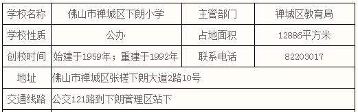 下朗小学创办于1959年,重建于1992年。校园占地总面积12886㎡,校舍建筑总面积4518㎡。下朗小学在上级政府和教育局的正确领导和亲切关怀下,承载着过去的办学成效,围绕“做润泽生命成长的绿色教育”的办学理念,以办人民满意的教育为宗旨,把立德树人作为教育的根本任务,使学校的教育教学质量稳步提高,彰显了办学特色,建设新亮点。