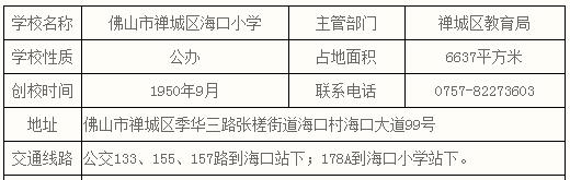 海口小学创办于1950年,学校位于禅城区张槎街道东南部海口村内,地处东平河畔,与石湾古镇、南风古灶风景区毗邻,季华三路横贯其中,城市化程度相对较高。校园占地面积6637平方米,建筑面积3219平方米,绿化面积为2893平方米,绿化覆盖率为43.6%。学校现有教学班12个,学生556人,教师31人。学校确立“海纳百川 德能并进”的办学理念,以“尚德博学,和谐发展”的学校主题文化为引领,围绕铸造“德能文化”,注重内涵发展,创建“三园”特色,推动学校优质发展,在全校师生的共同努力下,办学成效逐渐显著,办学特色日益彰显,如今学校已成为了广东省义务教育规范化学校、佛山市义务教育优质学校、佛山市德育示范学校、禅城区教育系统先进单位、禅城区科技教育先进学校、禅港姐妹学校缔结学校;禅城区体育传统学校、佛山市体育传统项目学校,广东省科学教育实践体验活动实验学校。全国“小小科学家”科学教育实践体验活动示范学校。
