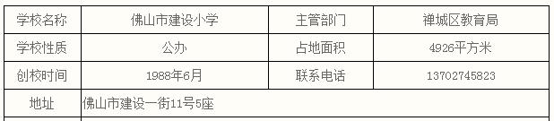 佛山市建设小学是市一级。创办于1988年6月,占地面积4926平方米。学校的环境优雅,设备设施齐全,有电脑室、语言实验室、自然实验室、音乐室、舞蹈室、美术室等。学校建有高标准的多媒体综合电教室两间,开通了视频、音频系统、校园网。