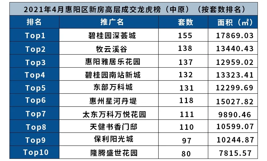 今年4月份,也是惠州“融湾入圈”动作最为频繁的一个月份,位于白云新城的碧桂园深荟城以155套的成交套数登上了惠阳区新房成交榜单第一位!